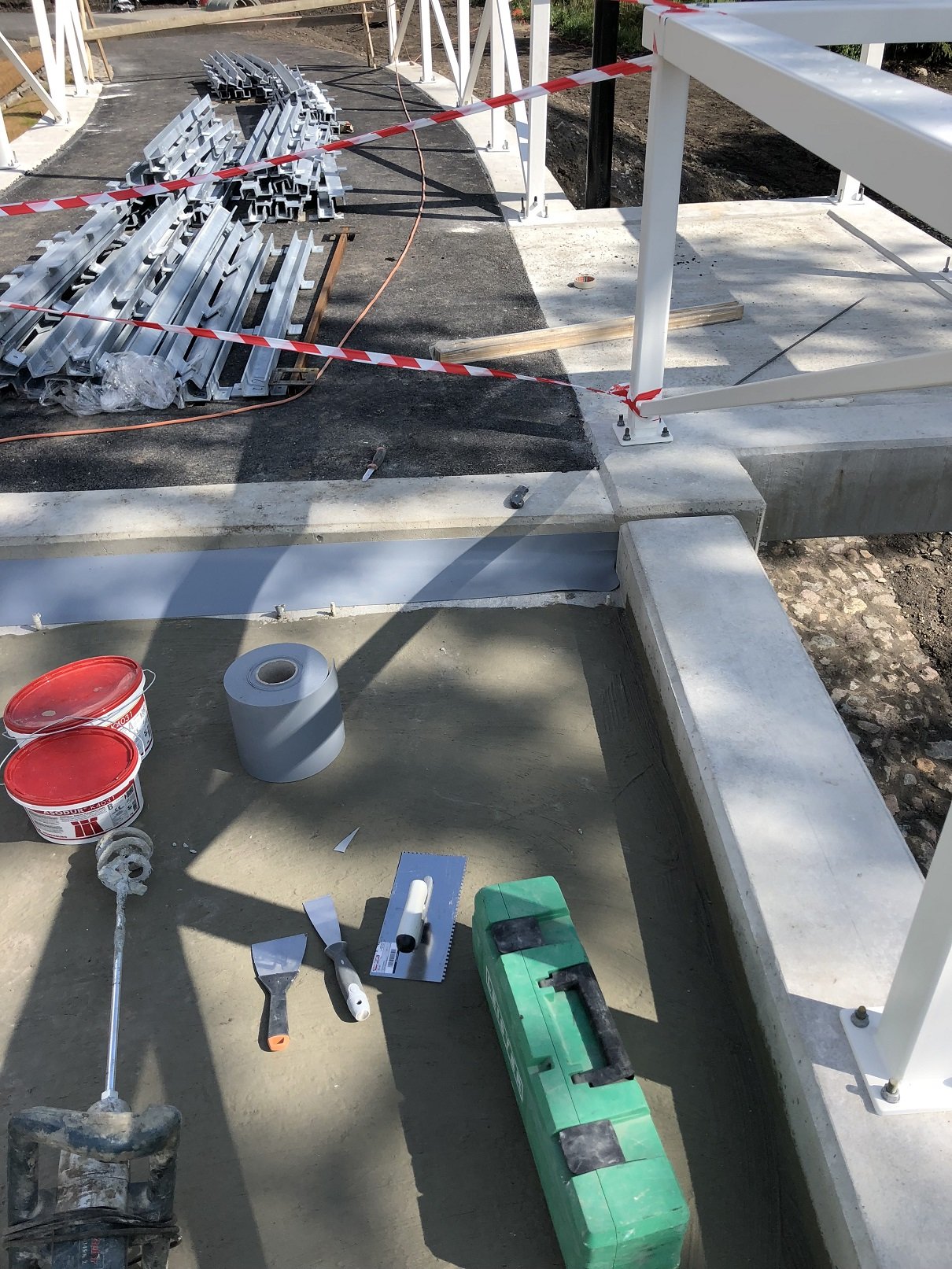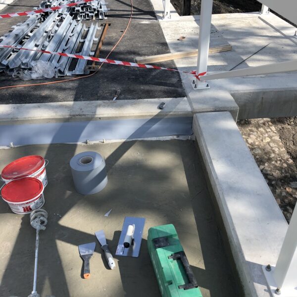Keila jalgteesilla hüdroisolatsioon elastse mineraalse hüdroisolatsioonivõõbaga ja deformatsioonivuugi tihendamine.