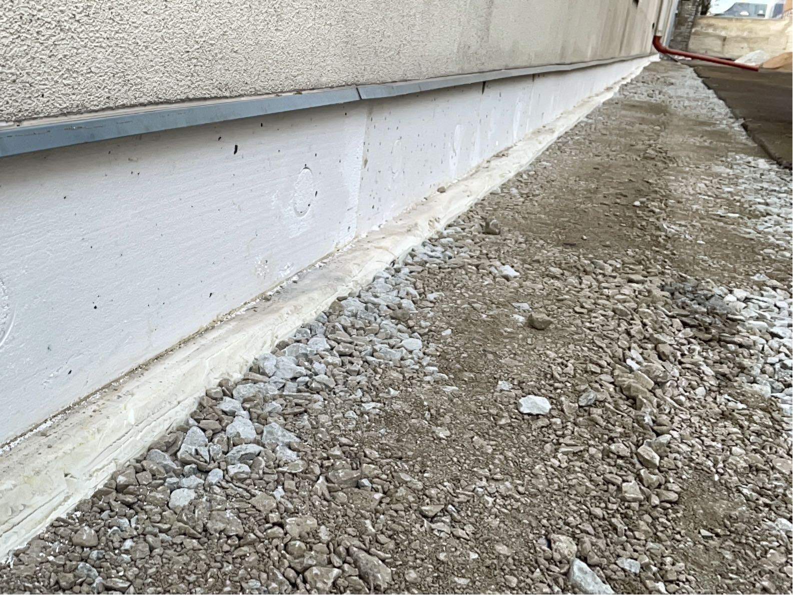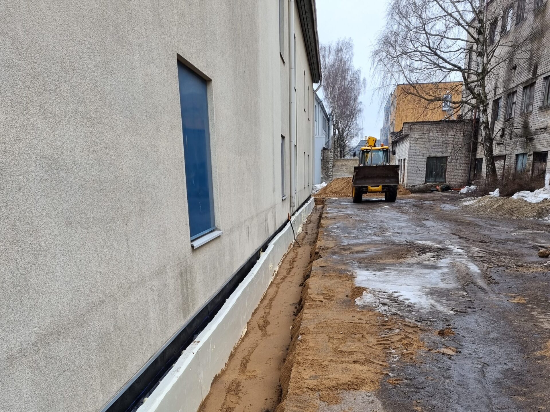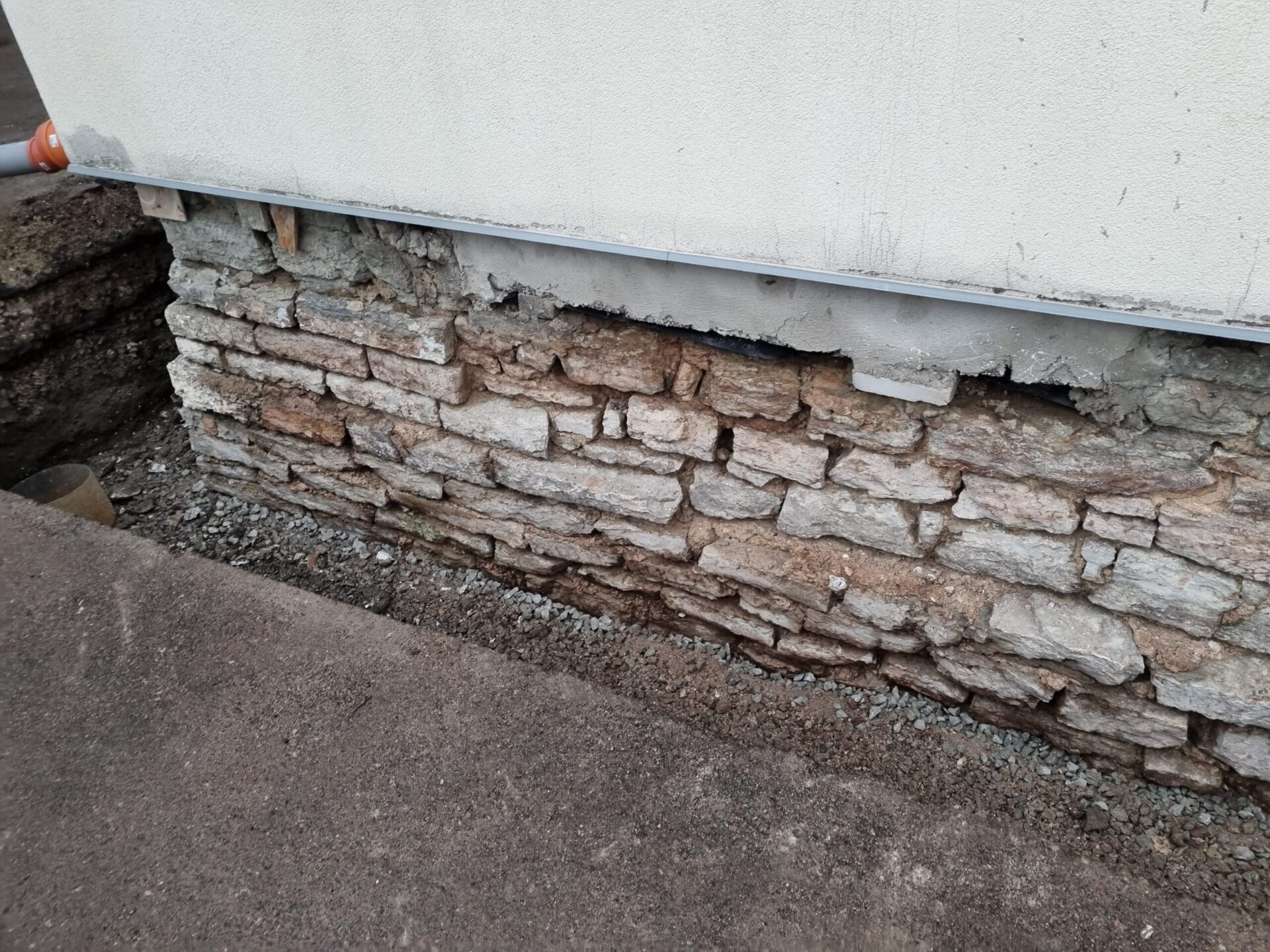 Hoone välisperimeetris eemaldasime asfaldi, kaevasime lahti vundamendi, puhastasime, täitsime ja tugevdasime pritsbetooniga. Sellele järgnes hüdroisolatsioon, milleks oli bituumenvõõba Combiflex-C2/S paigaldus. Hüdroisolatsioon talub ka survelist vett. Pritsitud võõbale paigaldati pärast kuivamist soojusisolatsioon Finnfoam F-300 100 mm. Kaevik täideti killustiku ja täiteliivaga ning hoone serva ehitasime raudbetoonist panduse, et sadevett hoonest eemale juhtida. Sokkel soojustati, armeeriti ja krohviti mosaiikkrohviga.