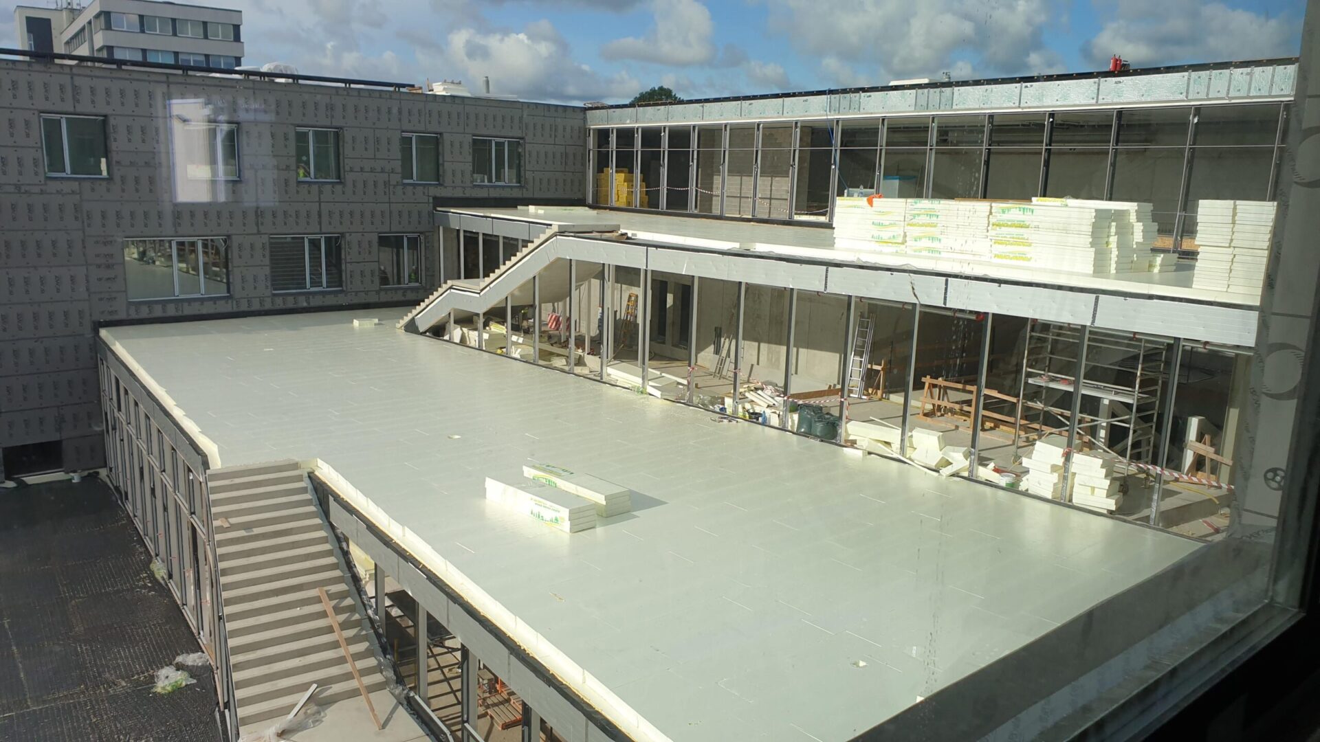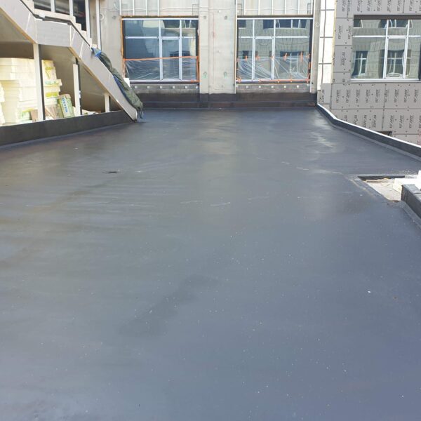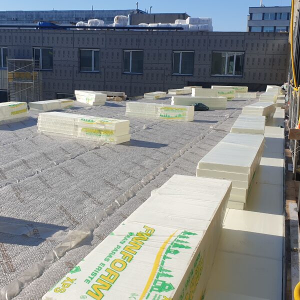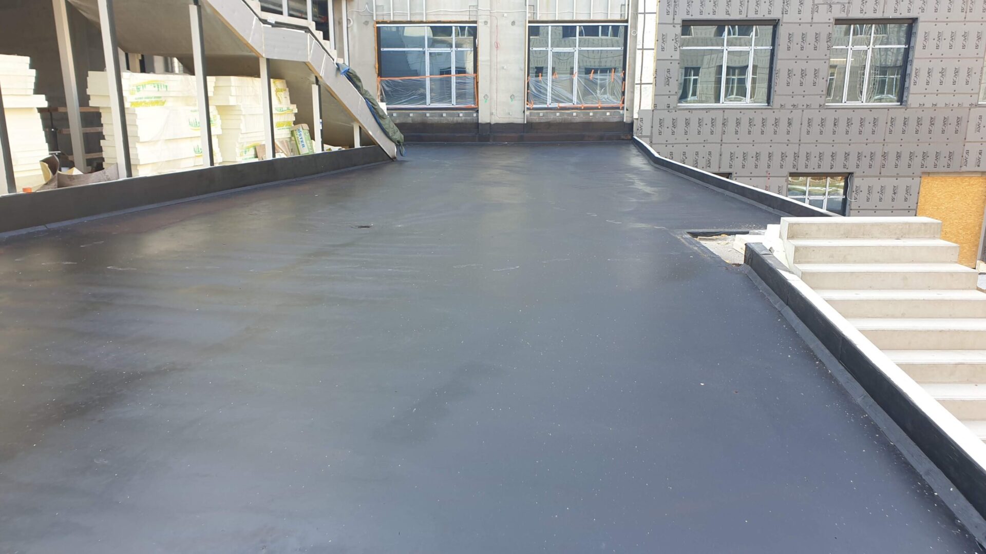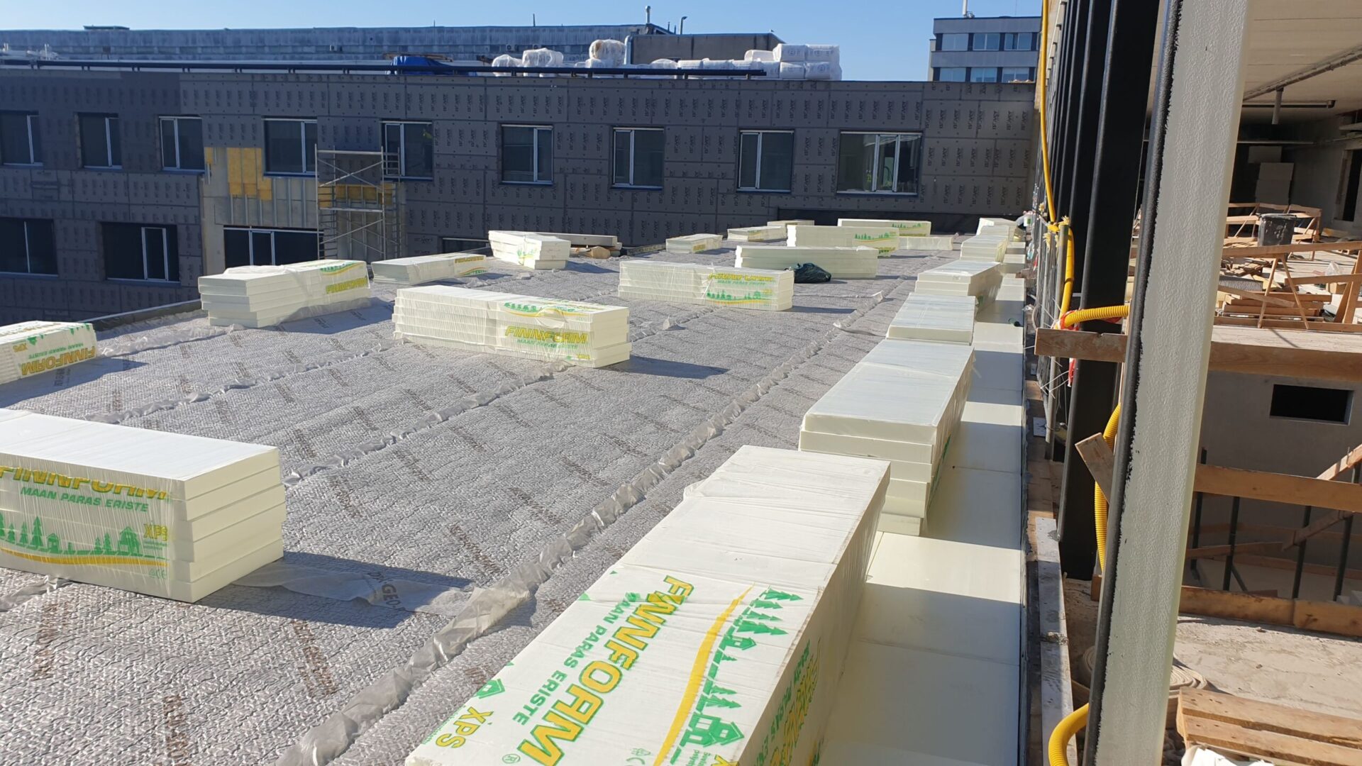 Uues Muusika- ja Balletikooli sisehoovis ja ujula peal asuvad kokku neli katuseterrassi, mis on lahendatud pööratud katuse konstruktsiooniga. Sarnase lahendusega on tagatud ka terasse ühendavate treppide veekindlus. Katuseid läbivad deformatsioonivuugid lahendasime epoliimi ja termoplastist vuugilindiga ASO-Tape. Terrasside hüdroisolatsiooniks kasutasime liimitavat membraani Köster KSK SY 15. Hüdroisolatsioon sai dreenkihiks geotekstiili ja libisemiskihiga dreenamti Delta Geo-Drain-Quattro. Pööratud katused soojustasime XPS Finnfoam FL400 materjaliga, mille paksus oli 300 kuni 400 mm. Soojustuse peale valas betoonitööde teostaja betoonist plaadi.